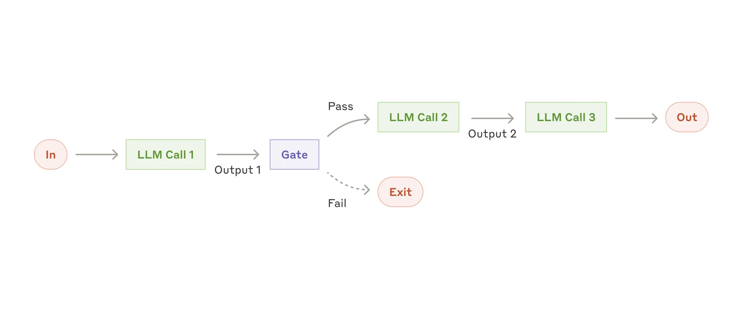 提示词链式调用将一项任务拆解为一系列步骤,其中每次大语言模型调用都处理前一次调用的输出结果。你可以在任意中间步骤加入程序化检查(见下图中的“门控”/“gate”),以确保整个流程仍在正确轨道上运行。